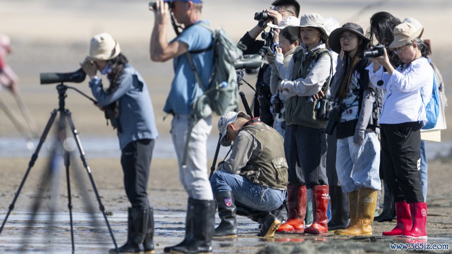 2025年11月9日,中外不雅鸟嗜好者在泉州围头湾滩涂上不雅测勺嘴鹬。新华社记者 魏培全 摄