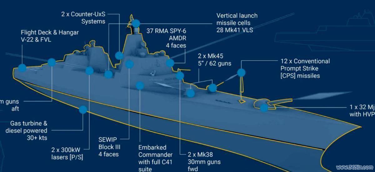 那么,这枚一款“返祖”的战列舰长啥样呢?发布会现场也给了几张图,看起来确切英武雄健,而PPT上的数据更是异常惊东谈主:舰256-268米,舰宽32-33.5米,排水量4万吨,最大航速跳跃30节,舰员数目650-850东谈主。火器装备更是惊东谈主:AN/SPY-6相控阵雷达、128单位MK41垂发、12枚CPS宽敞导弹、1座电磁轨谈炮、2座127毫米舰炮、激光火器、反无东谈主机系统等等。不管是吨位也曾军备,齐远超苏联基洛夫级巡洋舰,一举成为二战后最强军舰。